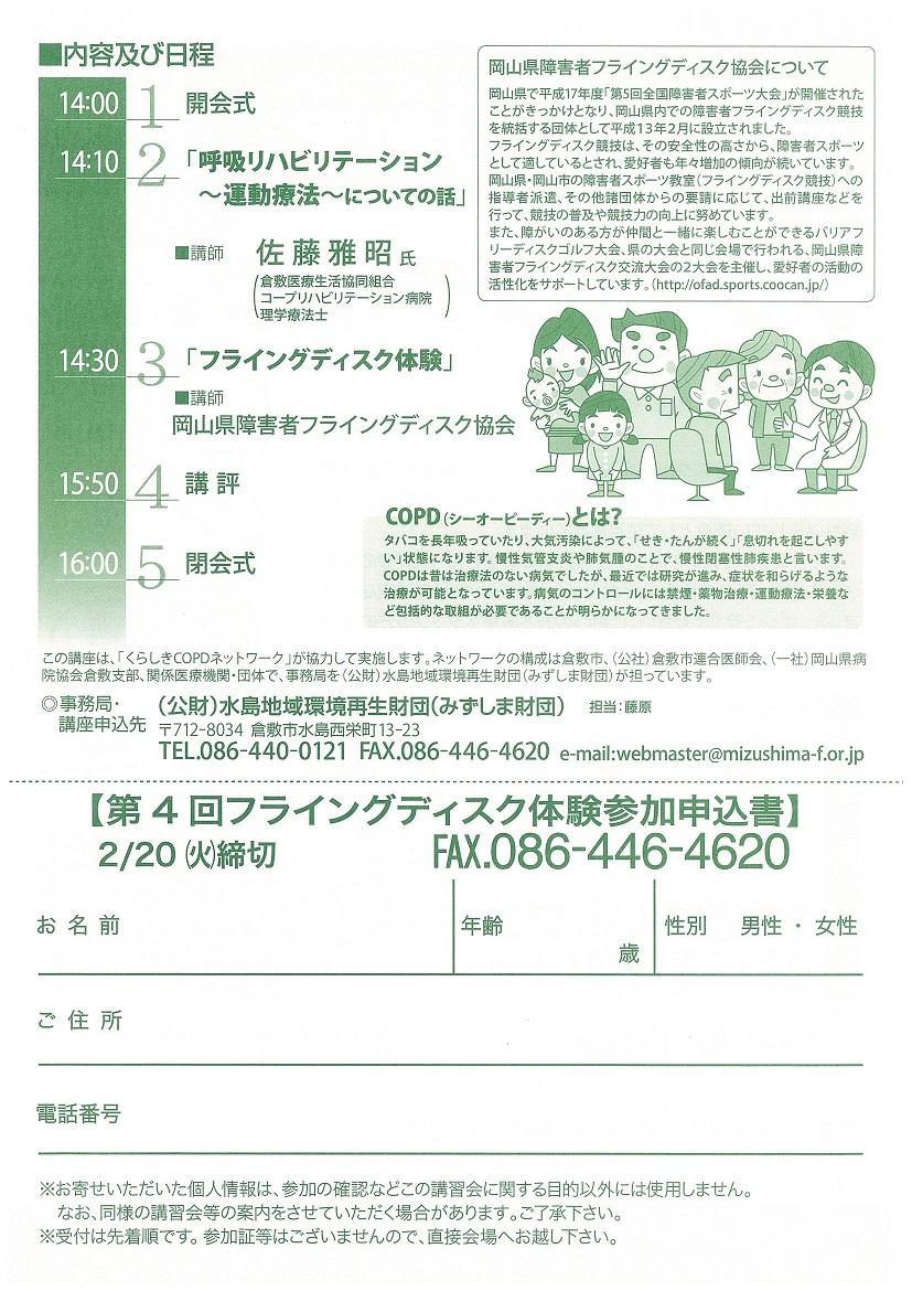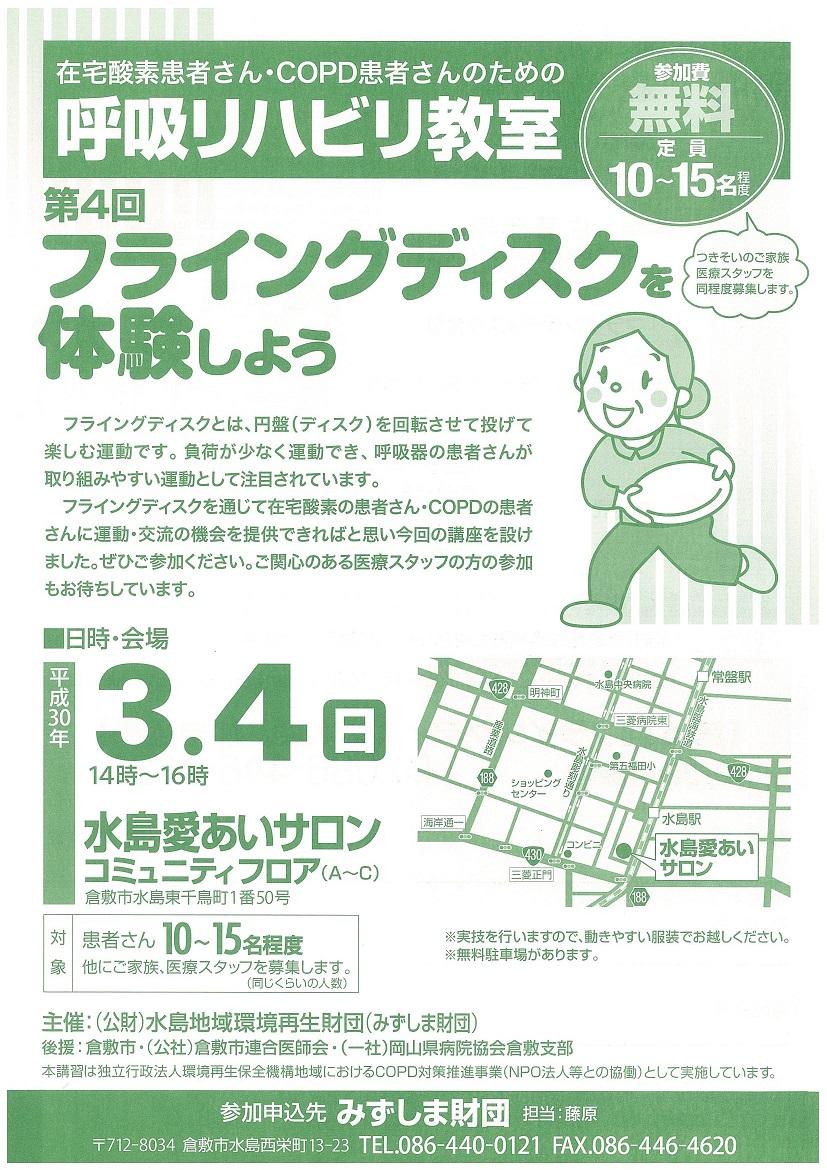 2018年3月4日(日)14~16時、水島愛あいサロンコミュニティフロア(A~Cにて、)呼吸リハビリ教室を実施します。