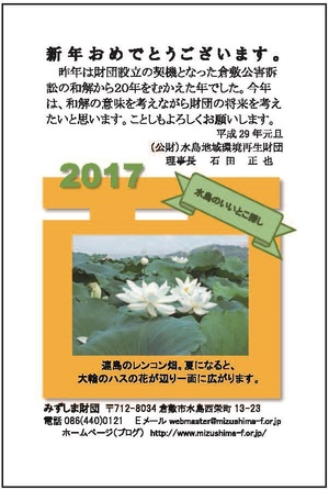 2017.01.05 あけましておめでとうございます 新年あけましておめでとうございます。 昨年末には、多くの方にご協力をいただき、 シンポジウム「世界一の環境学習のまち みずしまを目指して」を 開催することができました。 この成果を活かし、さらなる発展を目指していきたいと思います。 本年も、どうぞよろしくお願いいたします。