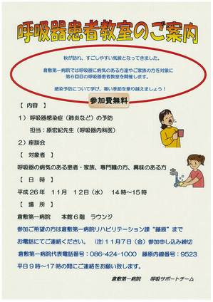 2014.10.28 Category: 環境保健 【他団体情報】11/12 呼吸器患者教室のご案内 ~倉敷第一病院~ 倉敷第一病院で、11月12日(水)14~15時、 第6回目にあたる呼吸器患者教室が開かれます。 呼吸器感染症(肺炎など)の予防のお話を呼吸器内科医の原宏紀先生がされます。 対象は、呼吸器の病気のある患者さんやご家族、専門職の方、興味のある方となっています。 原先生は昨年、倉敷市保健所の研修でもお話されました。 みずしま財団では、 地域のイベントや各病院で開催されている 呼吸器患者さん向けの教室の情報を収集したり、 発信することで、地域全体でのとりくみにつながるネットワークにと、考えています。