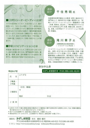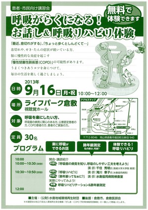2013.09.12 Category: 環境保健 呼吸リハビリ体験のご案内 (9/16) ライフパーク倉敷 呼吸リハビリ ご家族やご友人など、 呼吸をらくにしたいな・・・と思っている方が身近にいませんか? お話を聞いて、体験できる講習会があります。 9月16日(祝・月)10~12時 ライフパーク倉敷視聴覚ホール 無料です。 詳しくはみずしま財団086-440-0121までお問い合わせください。 無料です。