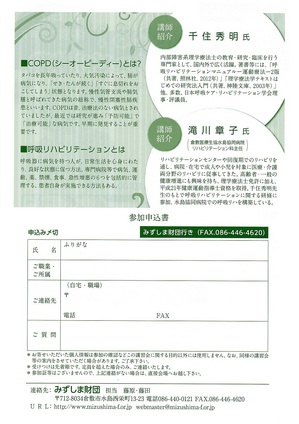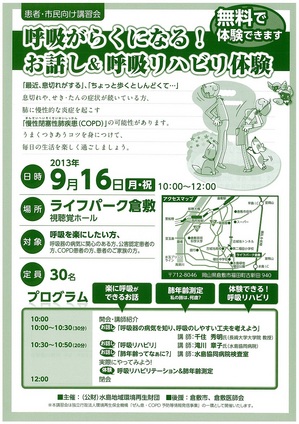 2013.09.05 Category: 環境保健 呼吸リハビリの体験 あります 9/16(月・祝) COPD イベント告知 ライフパーク倉敷 呼吸リハビリ 独立行政法人環境再生保全機構 呼吸リハビリの体験講座が、 9月16日(祝・月)ライフパーク倉敷視聴覚ホールであります。 無料です。患者さんや市民の方向けです。 日常生活の中での工夫もあり、ご家族のかたもごいっしょにどうぞ、 ご参加ください。 主催:みずしま財団 (独法)環境再生保全機構「ぜん息・COPD予防等情報発信事業」としての実施です。 お申込み みずしま財団 086-440-0121まで、ご連絡ください。