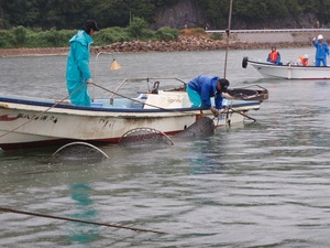 参加者は、小型の漁船に分乗して、定置網まで移動します。