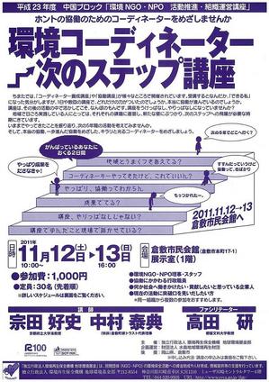 2011.09.29 Category: みずしまプロジェクト 募集スタート! 11月12,13日 環境コーディネーター次のステップ講座 イベント告知 環境コーディネーター 環境コーディネーター 次のステップ講座 募集スタートしました。 お申込み・お問い合わせ先 電話:086-440-0121 webmaster@mizushima-f.or.jp 担当 藤原、白神