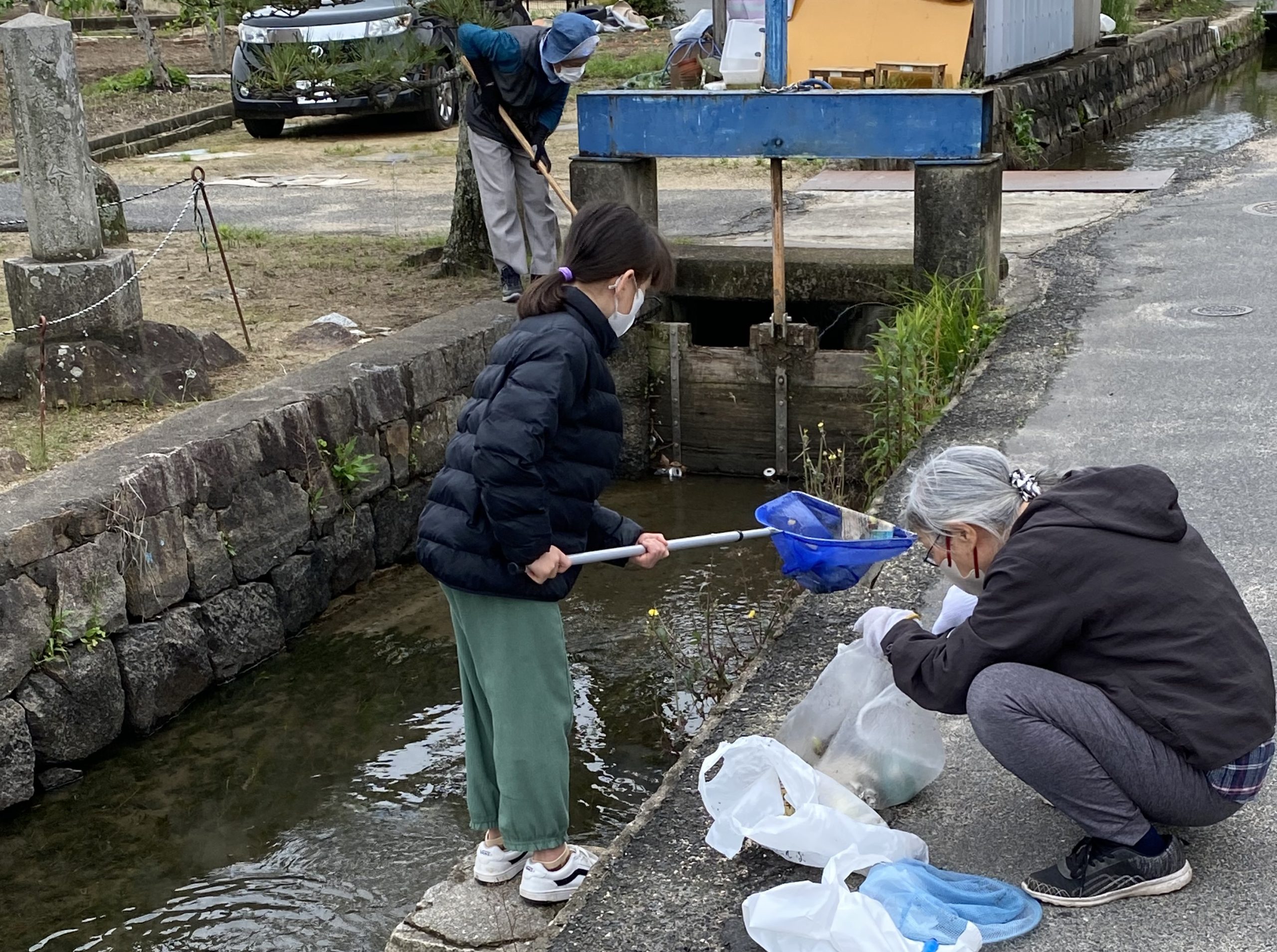 今回は倉敷市上富井の黒石用水という場所でごみ回収をしました。黒石用水は底が舗装されていない二面張りの水路であり、三面張りの水路より生態系が豊富で比較的水質の良い綺麗な水路です。