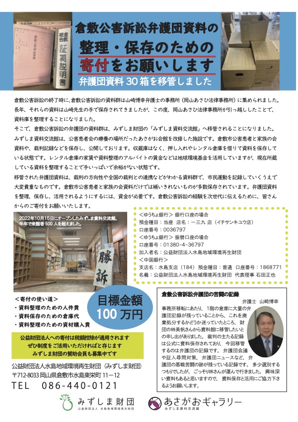 倉敷公害訴訟の終了時に、倉敷公害訴訟の資料群は山崎博幸弁護士の事務所(岡山あさひ法律事務所)に集められました。 長年、それらの資料は山崎先生の手で保存されてきましたが、この度、岡山あさひ法律事務所が引っ越ししたことで、 資料庫を整理することになりました。 そこで、倉敷公害訴訟の弁護団の資料群は、みずしま財団の「みずしま資料交流館」へ移管されることになりました。 みずしま資料交流館は、公害患者会の療養の場所だったあさがお会館を改修した施設です。倉敷市公害患者と家族の会 資料や、裁判記録などを保存し、公開しております。収蔵庫はなく、押し入れやレンタル倉庫を借りて資料を保存して いる状態です。レンタル倉庫の家賃や資料整理のアルバイトの賃金などは地球環境基金を活用していますが、現在所蔵 している資料を整理することで手いっぱいで余裕がない状態です。 移管された弁護団資料は、裁判の方向性や全国の裁判との連携などがわかる資料群で、市民運動を記録していくうえで 大変貴重なものです。倉敷市公害患者と家族の会資料だけでは補いきれないものが多数保存されています。弁護団資料 を整理、保存し、活用されるようにするには、資金が必要です。倉敷公害訴訟の経験を次世代に伝えるために、皆さん からのご寄付をお願いいたします。