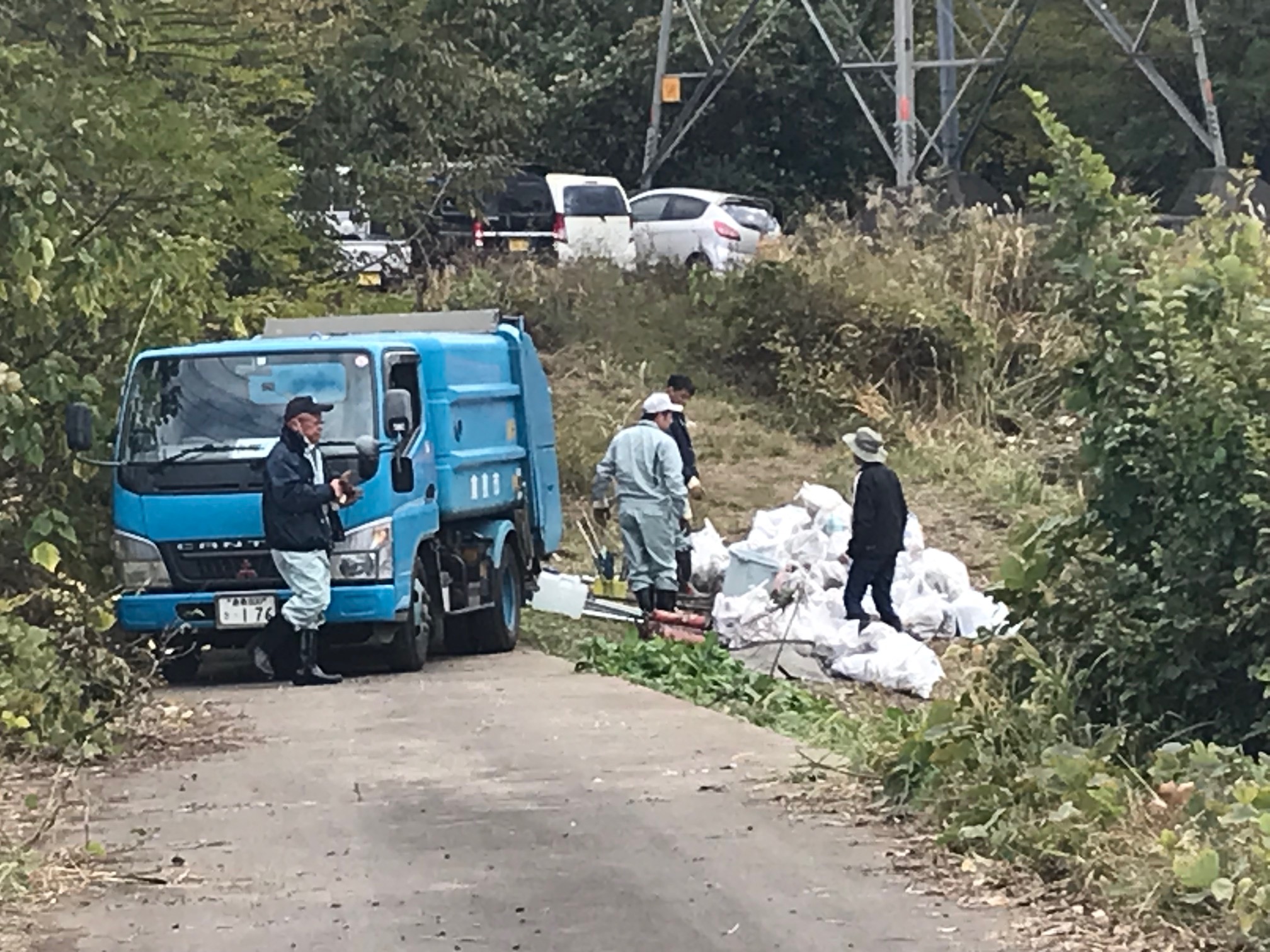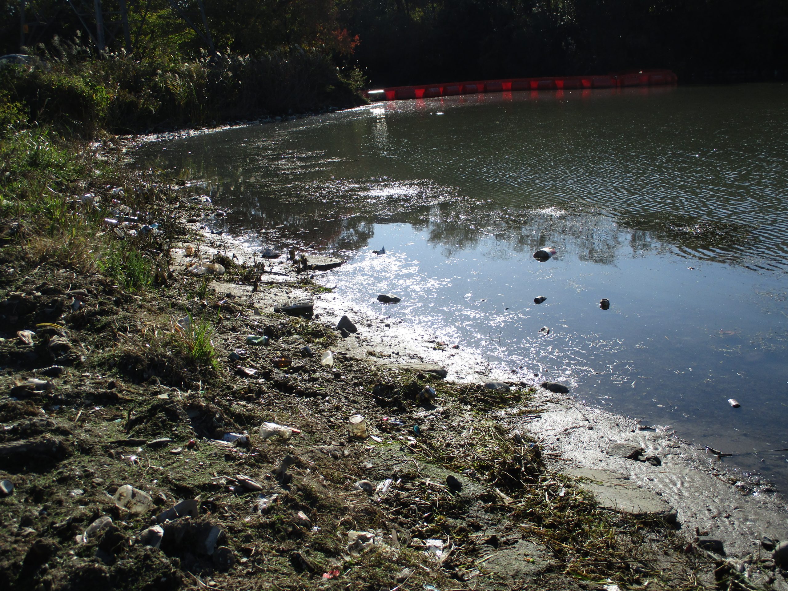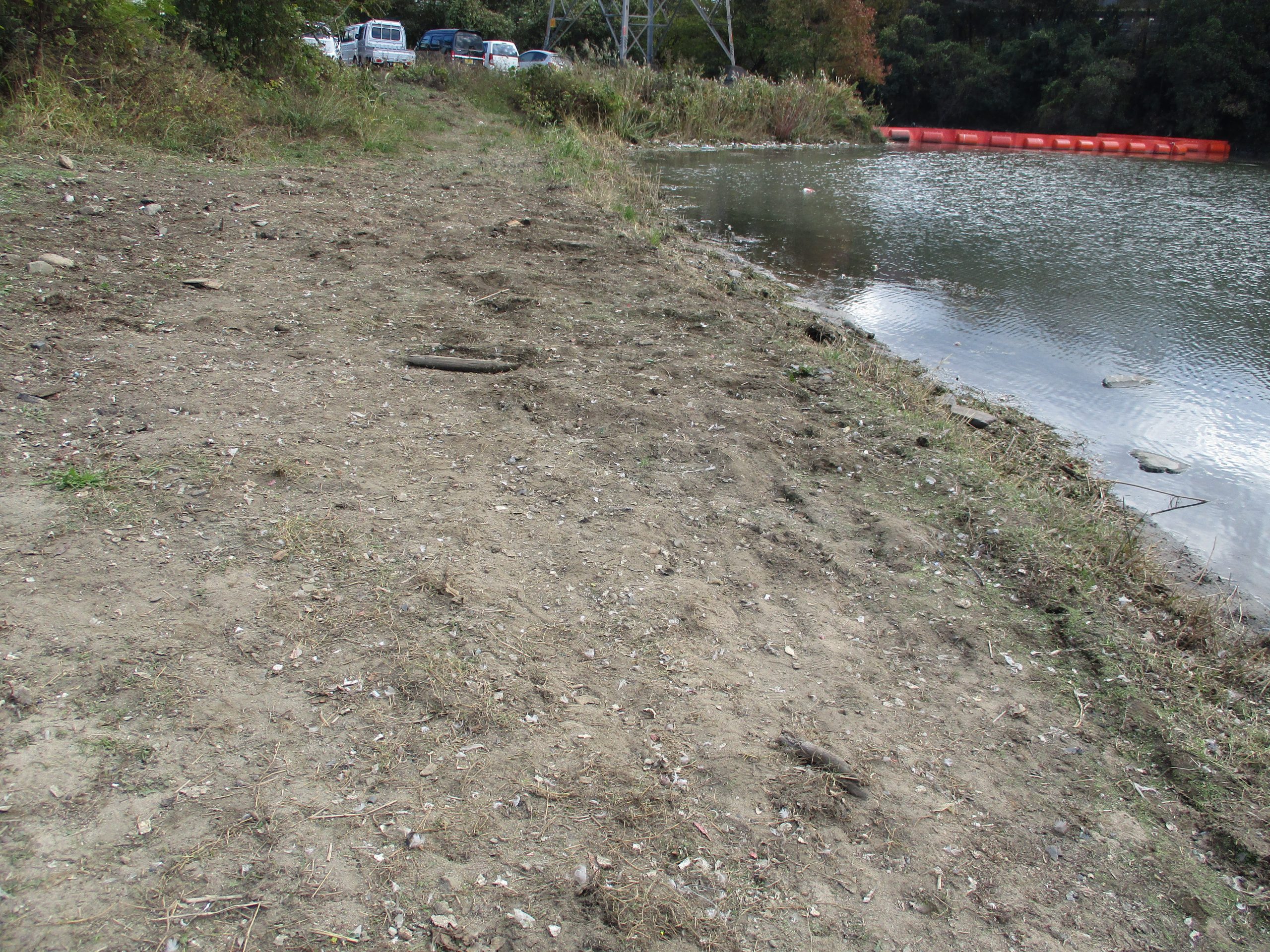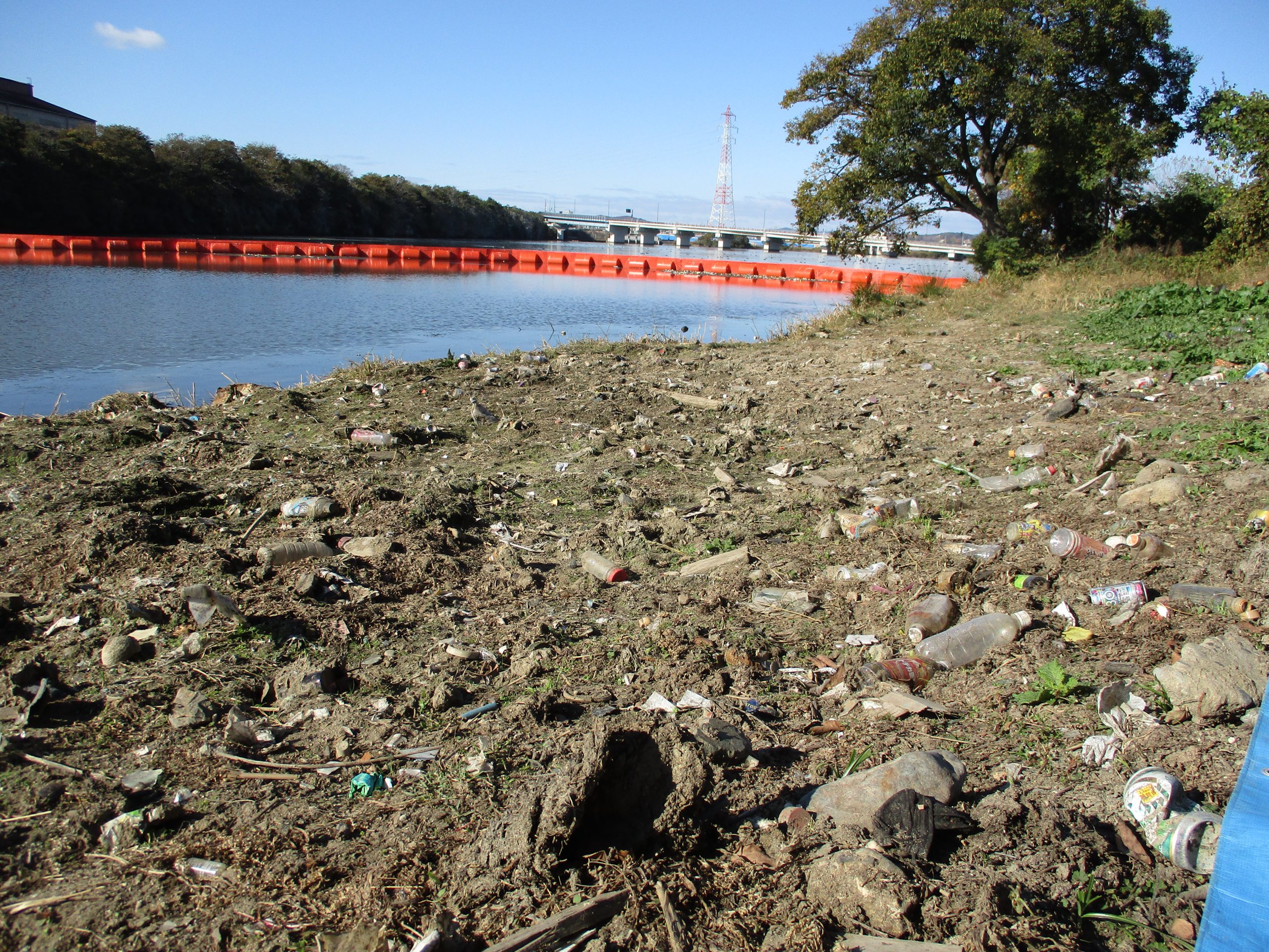 会場の八間川遊水池は、八間川や西部排水路(塩入川)の最下流部にあたり、行政によるオイルフェンスを張った回収も行われていますが、それでもかなりの量が堆積していました。