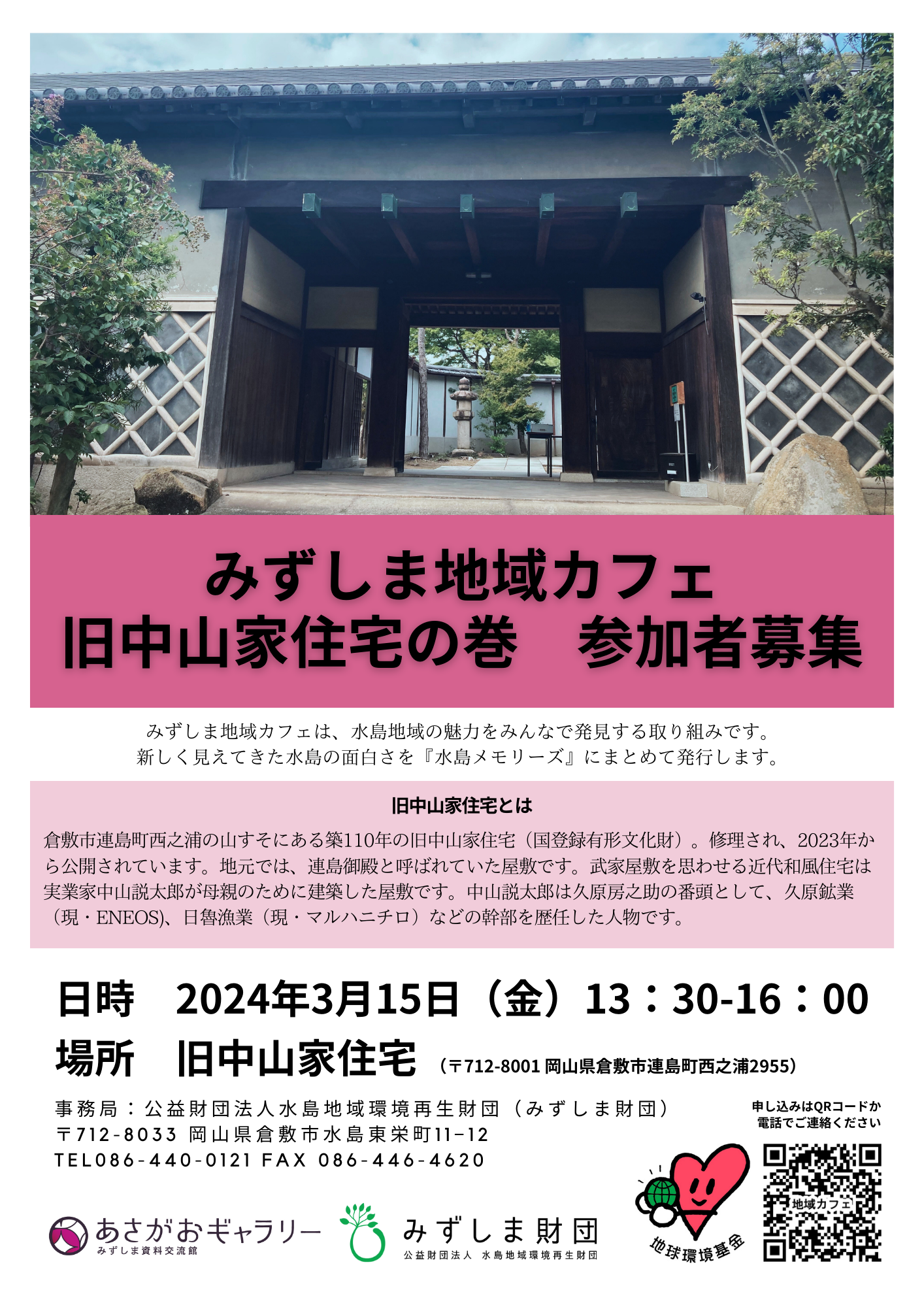 2024.02.23 Category: あさがおギャラリー みずしま地域カフェ 旧中山家住宅の巻 参加者募集 資料館 3月15日(金)に13:30-16:00に連島の旧中山家住宅でみずしま地域カフェを開催します。 中山家住宅はこちら https://nakayamake.com/top.html ご都合がつく方はぜひご参加ください。 申し込みはこちらです。 https://forms.gle/jsJdPWGUmU2Wc2Uh9