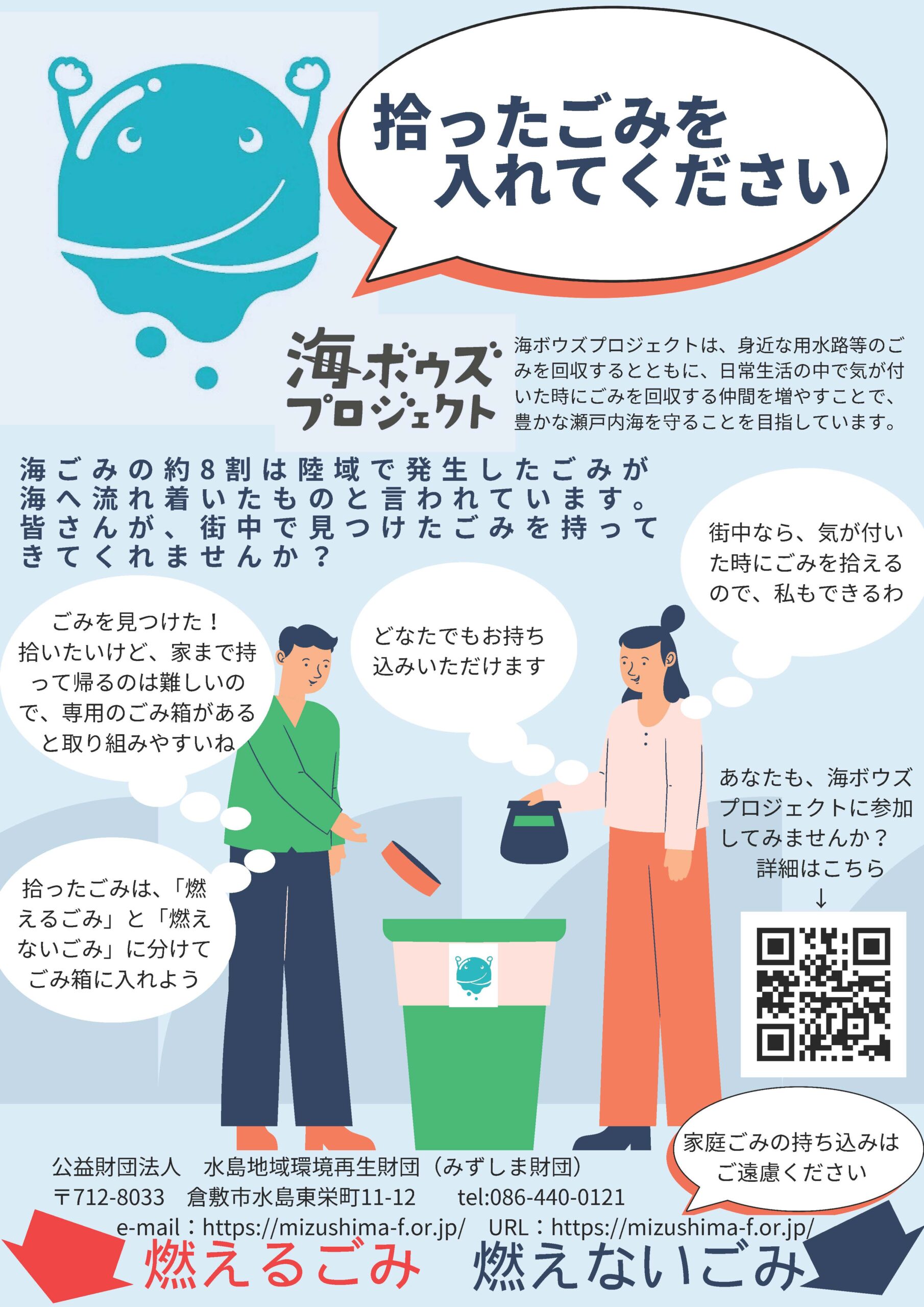 そこで、みずしま財団では、まちなかで見つけたポイ捨てごみを回収する「陸ゴミ回収ボックス」の取り組みを地域の公民館や倉敷医療生協と連携して始めました。