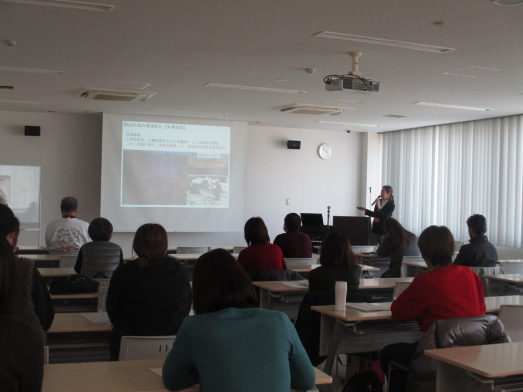 プログラムは、まず最初に、岡山県水産課の職員の方から「岡山の海と環境の変化」と題した講義をいただき、瀬戸内海の現状や、海の豊かさとはどういったものかを学んだ後、実際にクロダイを調理しました。