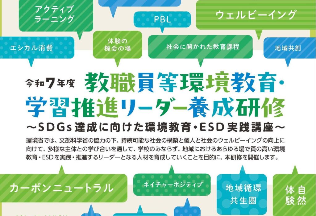 本研修は、持続可能な社会の構築と個人と社会のウェルビーイングの向上に向けて、多様な主体との学び合いを通して、学校のみならず、地域におけるあらゆる場で質の高い環境教育・ESDを実践・推進するリーダーとなる人材を育成していくことを目的に開催します。