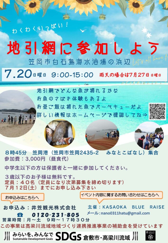 笠岡市をフィールドに、海の環境保全、青少年の健全育成を行い、未来ある子ども達に豊かな環境を繋いでいくことを目的に、昨年設立された「KASAOKA BLUE RAISE」さんが主催する地引網体験です。