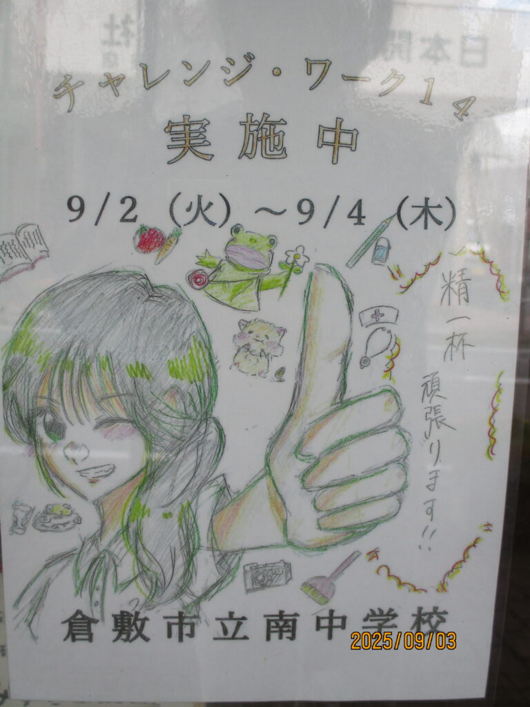 9/2-4(火‐木)にかけての3日間、昨年度に引き続き、倉敷市立南中学校チャレンジワークの受け入れを行いました。