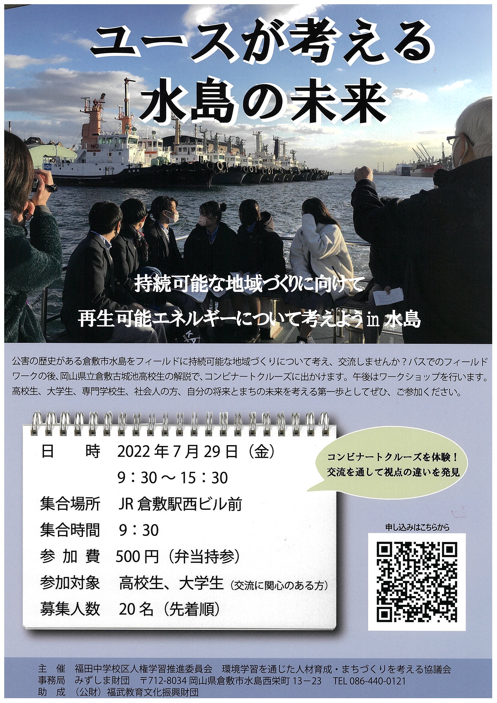 公害の歴史がある倉敷市水島をフィールドに、持続可能な地域づくりについて考え、交流しませんか?バスでのフィールドワークの後、岡山県立倉敷古城池高校生の解説でコンビナートクルーズに出かけます。午後はワークショップを行います。高校生、大学生、専門学校生、社会人の方、自分の将来とまちの未来を考える第一歩として、ぜひご参加ください。