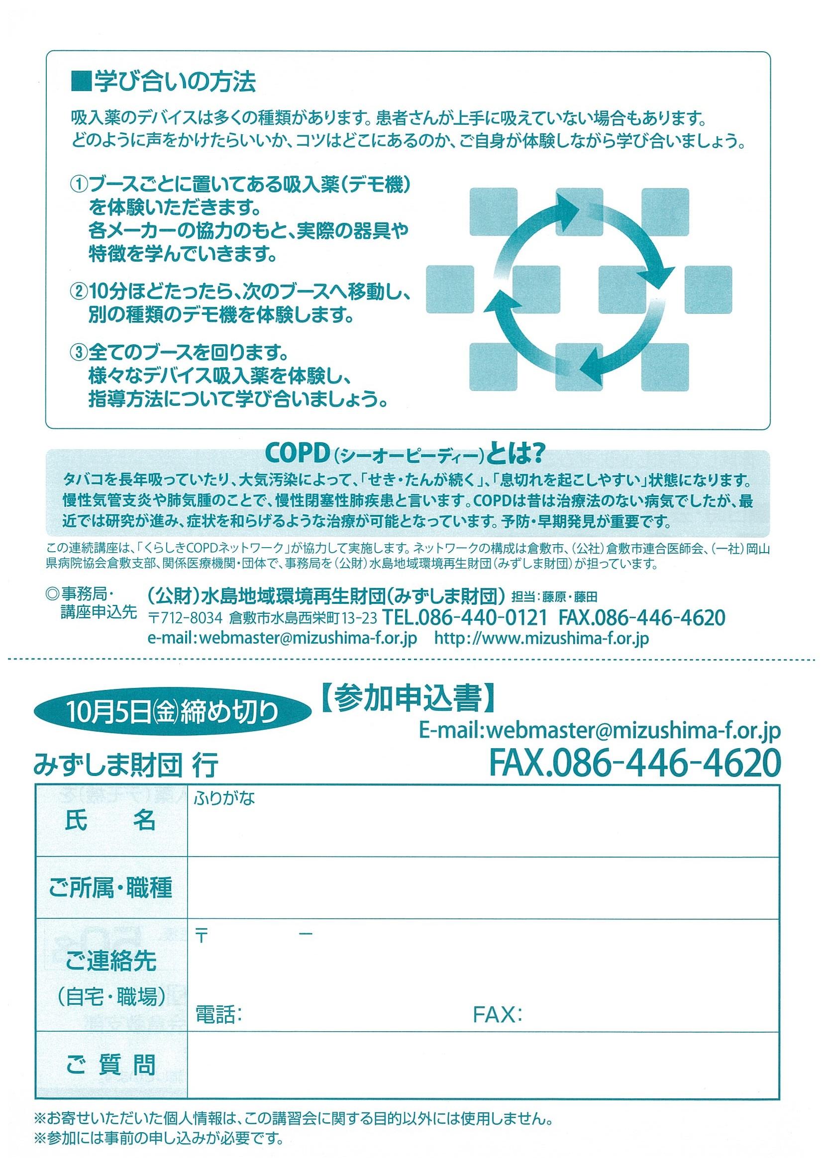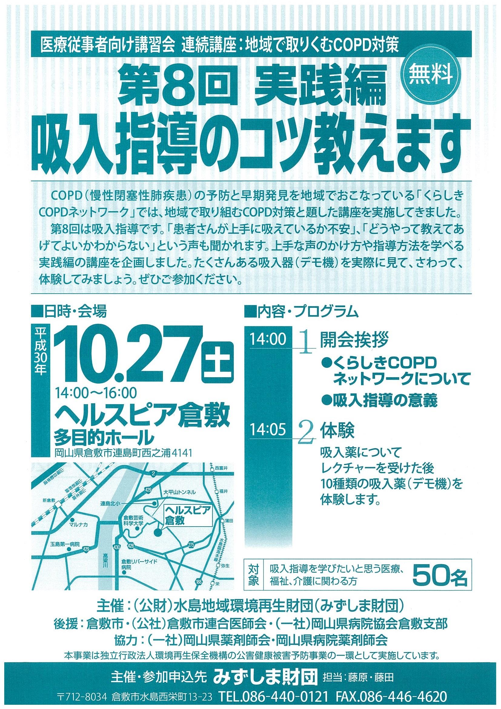 2018.10.05 Category: 環境保健 募集 10月27日(土)医療従事者向け講習会 実践編 吸入指導のコツ教えます。 吸入指導のコツ教えますと題した、実践編の講習会をおこないます。 実際に、吸入器(デモ機)をつかって、上手な声かけや指導方法を学びあいができます。 吸入指導を学びたいと思う医療、福祉、介護に関わる皆様、どうぞご参加ください。 10月27日(土)14~16時 ヘルスピア倉敷多目的ホール 環境再生保全機構 公害健康被害予防事業の一環として開催します。