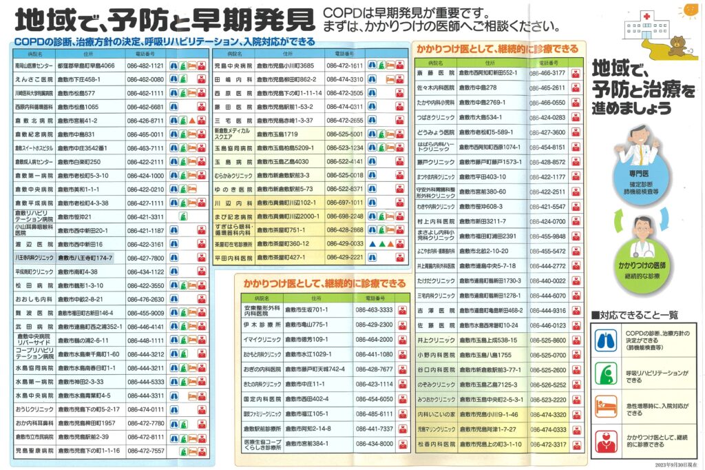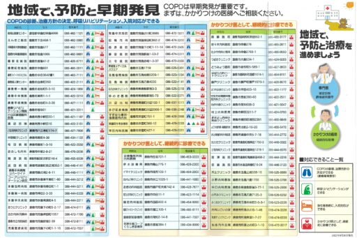 パンフレットの中面では、倉敷市内にある、COPDの診断、治療方針の決定、呼吸リハビリテーション、入院対応ができる医療機関と、かかりつけ医として継続的に診療できる医療機関を、わかりやすく紹介しています。