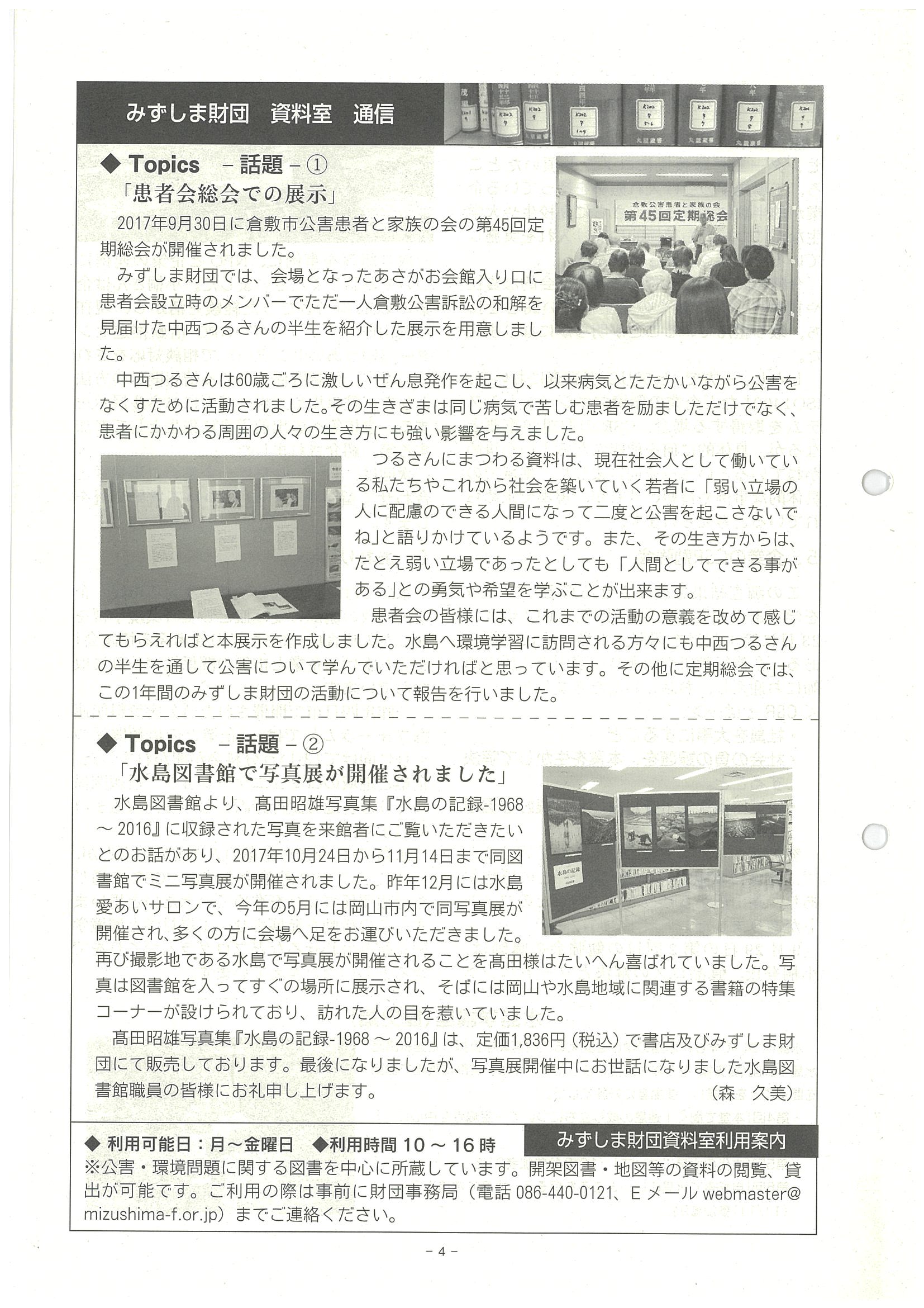 ■資料室通信Topics「患者会総会での展示」Topics「水島図書館で写真展が開催されました」森久美