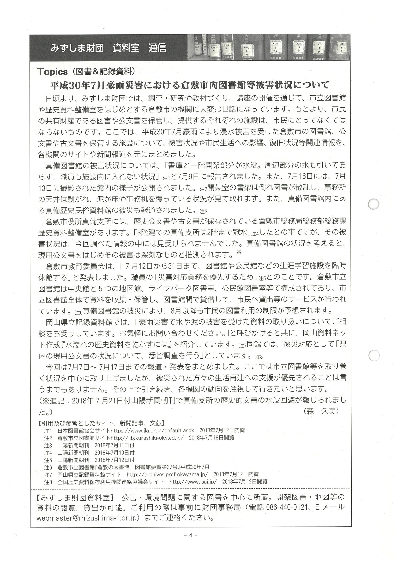 ■資料室通信Topics「平成30年7月豪雨災害における倉敷市内図書館等被害状況について」森久美