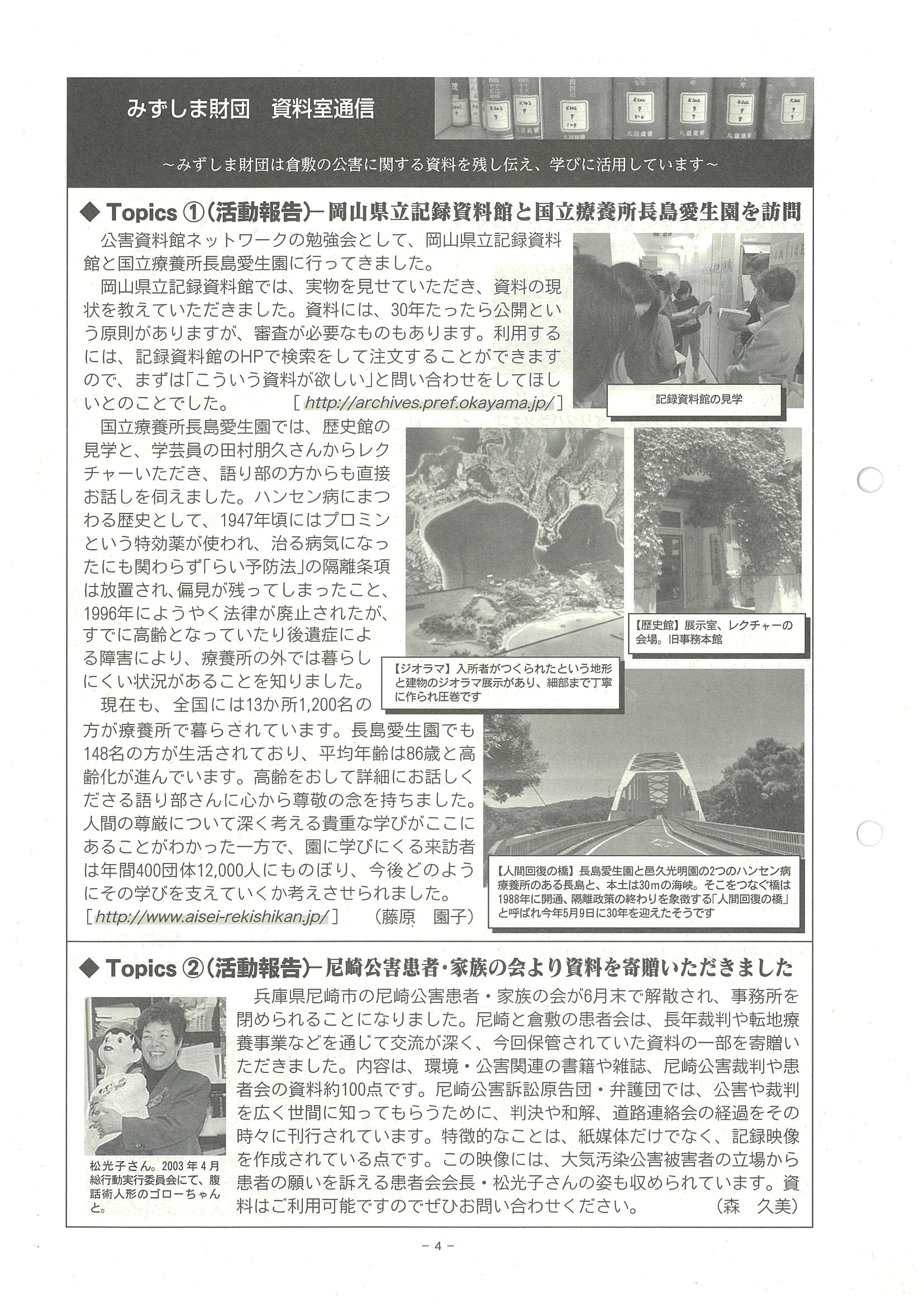 ■資料室通信Topics「岡山県立記録資料館と国立療養所長島愛生園を訪問」藤原園子 Topics「尼崎公害患者・家族の会より資料を寄贈いただきました」森久美