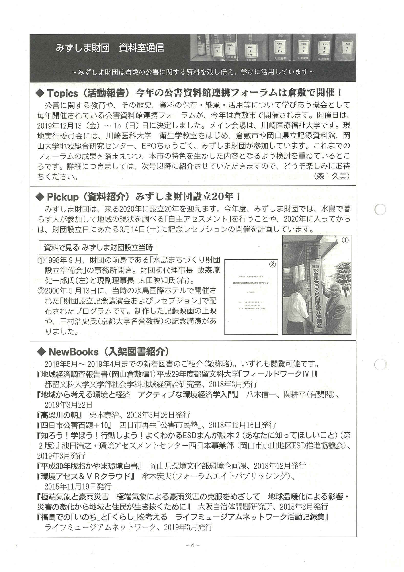 ■資料室通信Topics「今年の公害資料館連携フォーラムは倉敷で開催!」森久美 PickUp「みずしま財団設立20年!」NewBooks