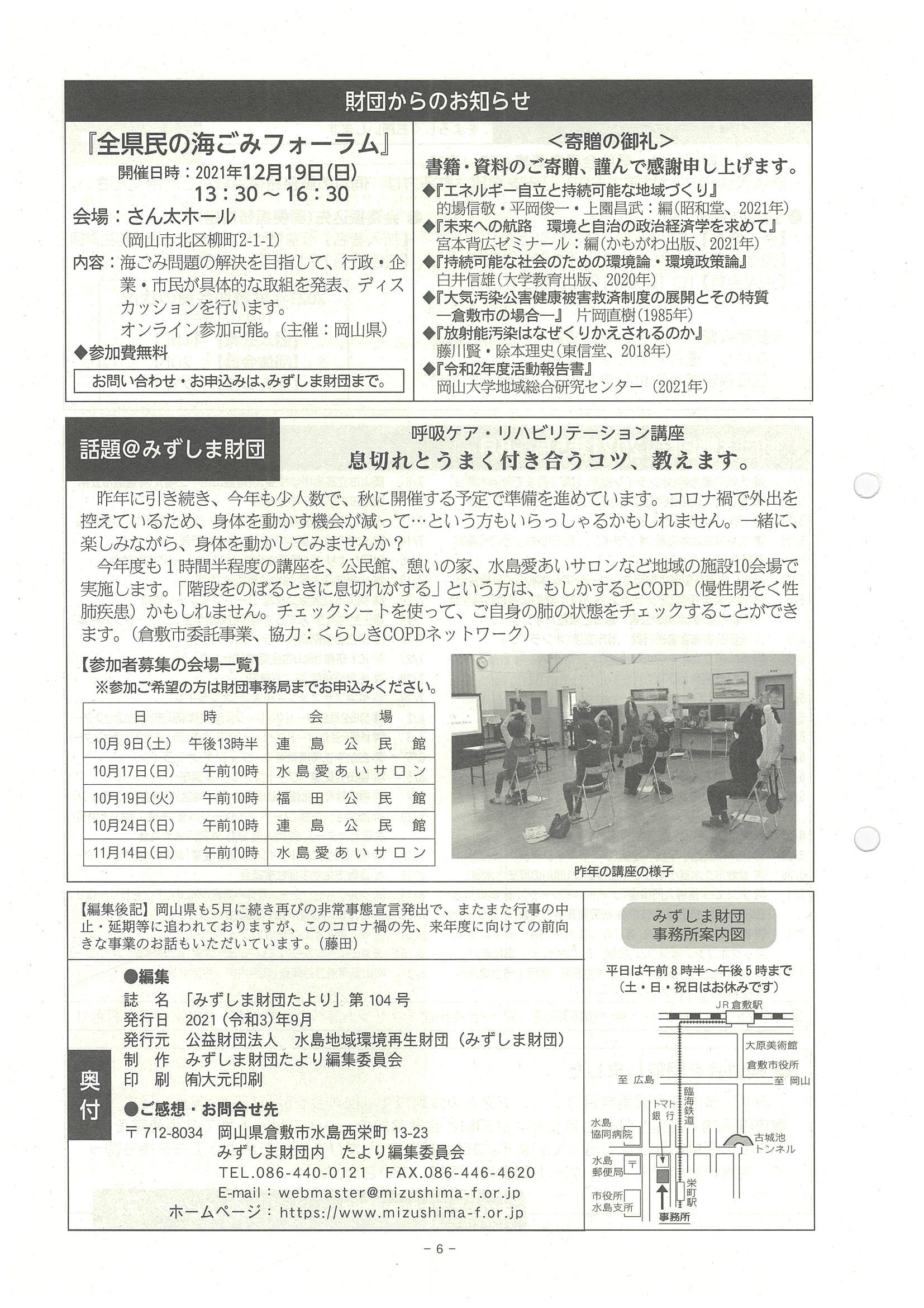 財団からのお知らせ、話題@みずしま財団「呼吸ケア・リハビリテーション講座 息切れとうまく付き合うコツ、教えます。」