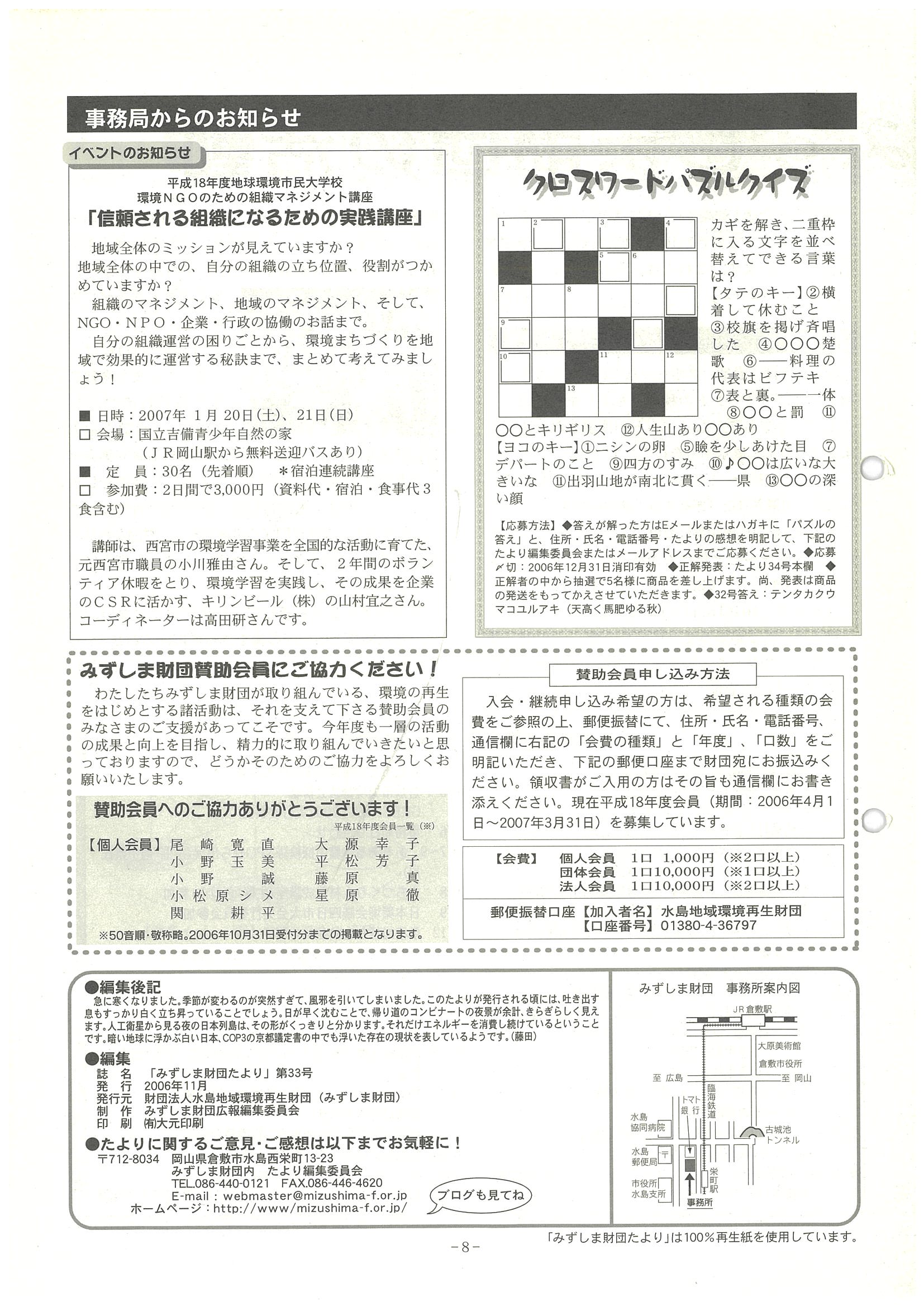 ■事務局からのお知らせ、賛助会員のお願い、クロスワードパズルクイズなど