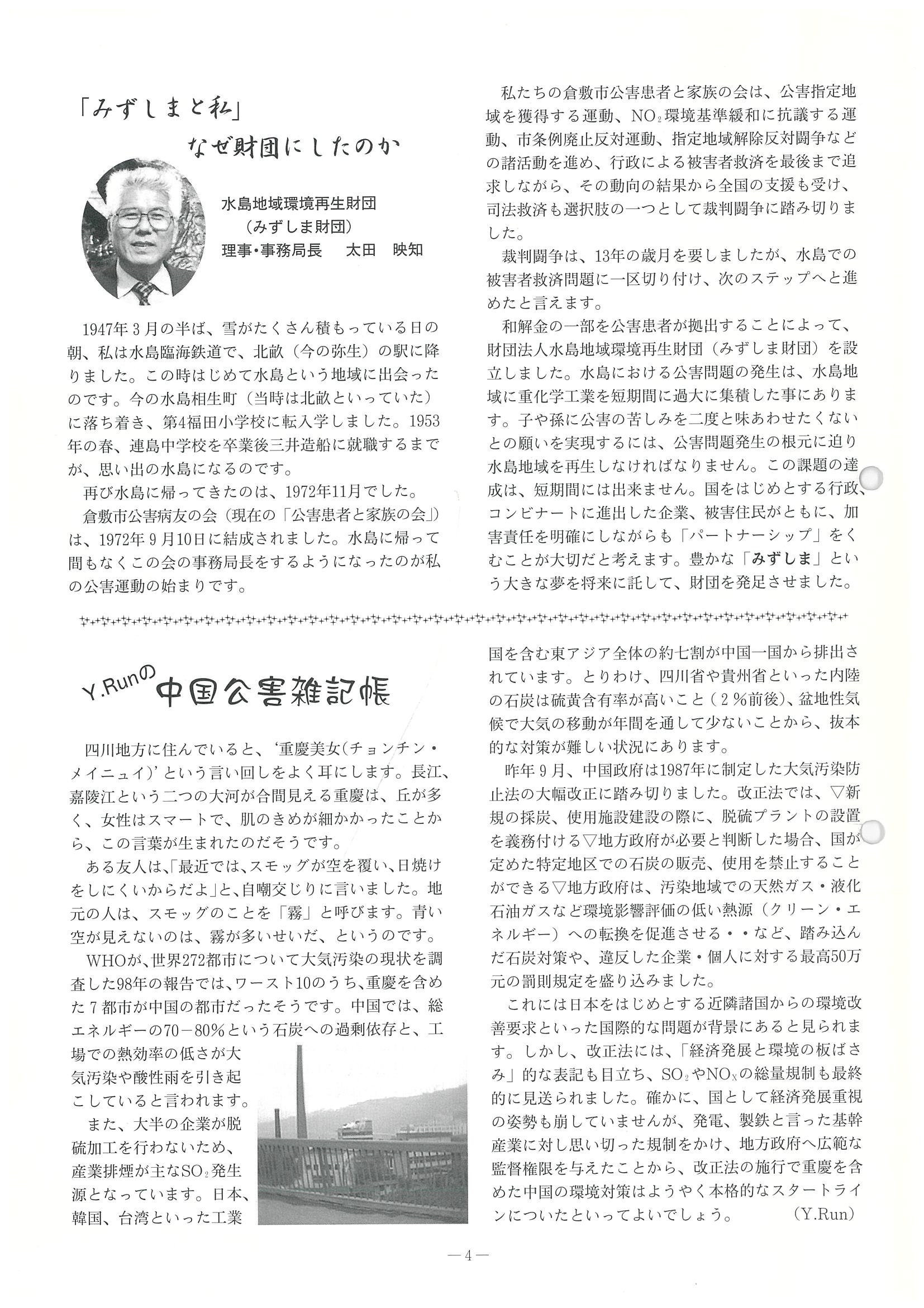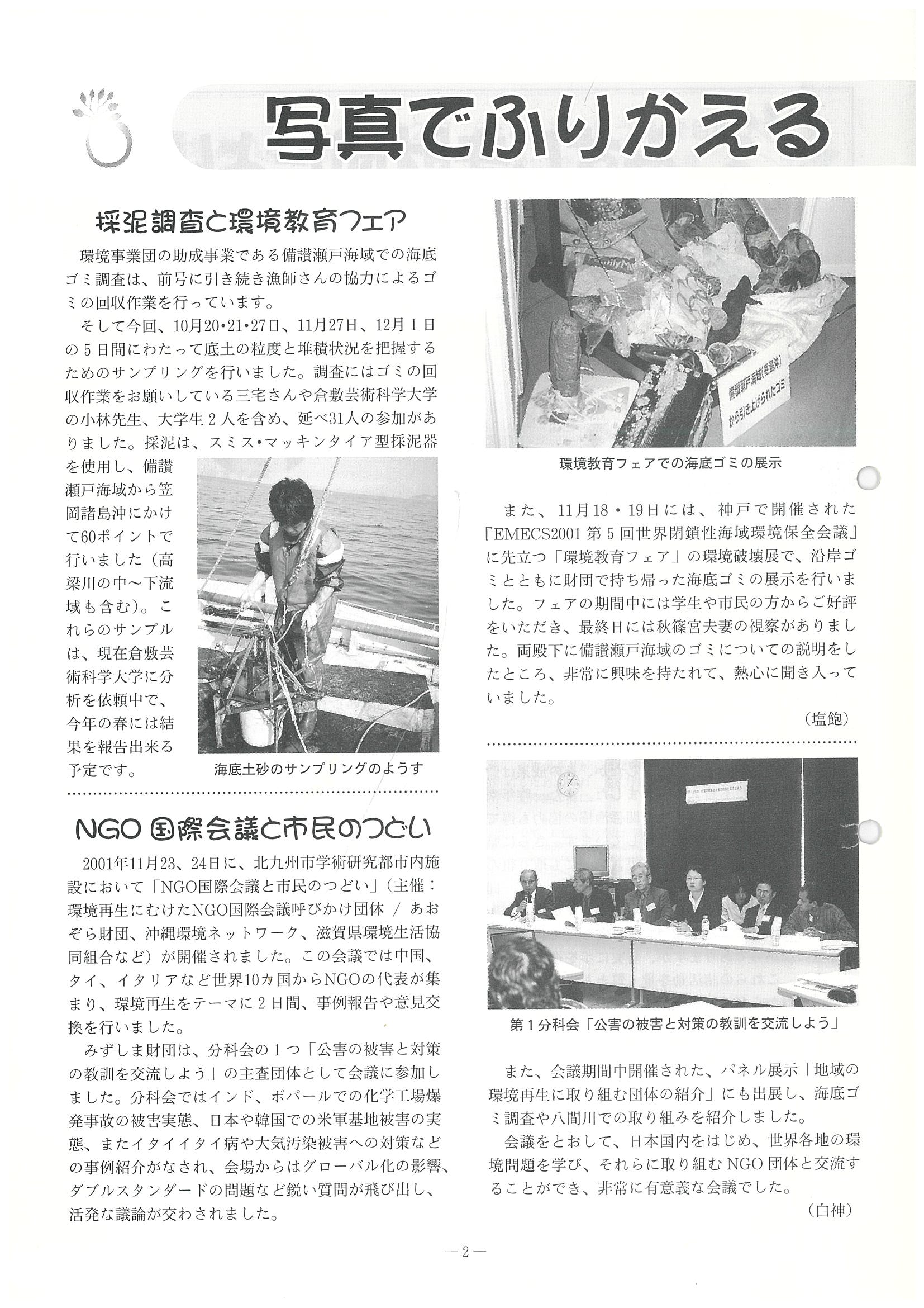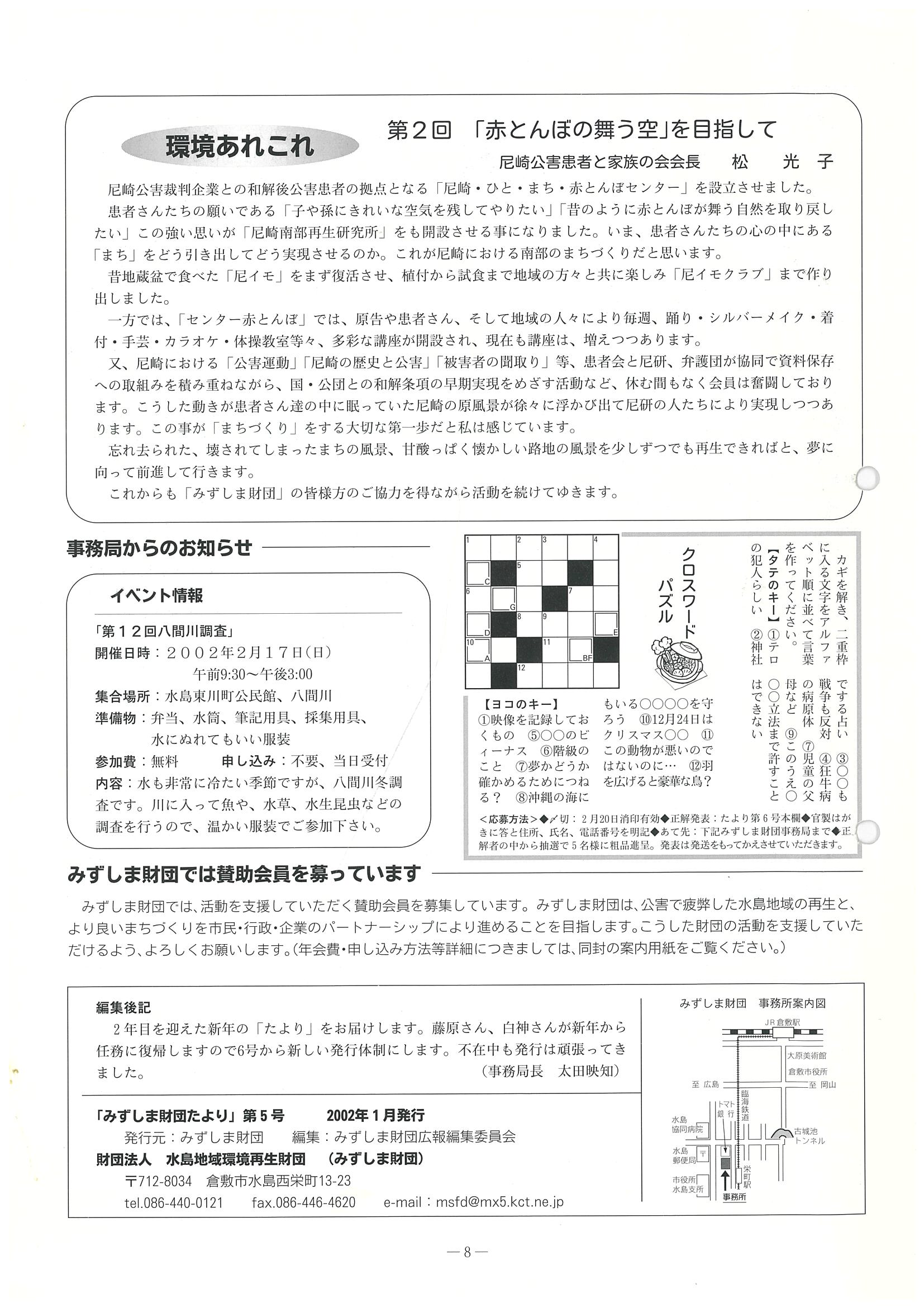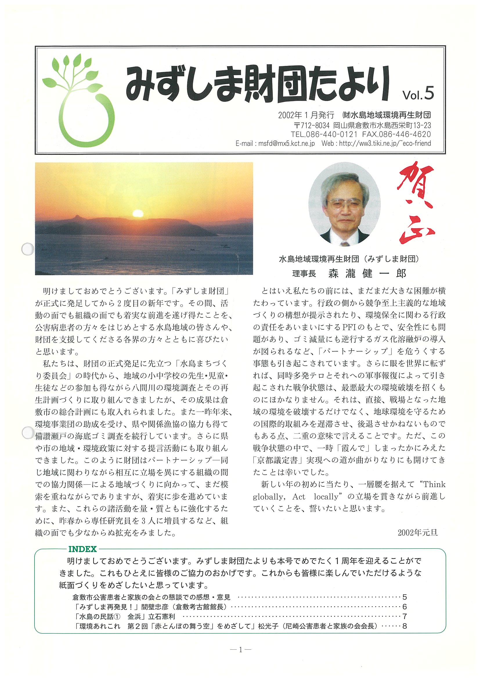 明けましておめでとうございます。みずしま財団たよりも本号でめでたく1周年を迎えることができました。これもひとえに皆様のご協力のおかげです。これからも皆様に楽しんでいただけるような紙面づくりを目指したいと思っています。