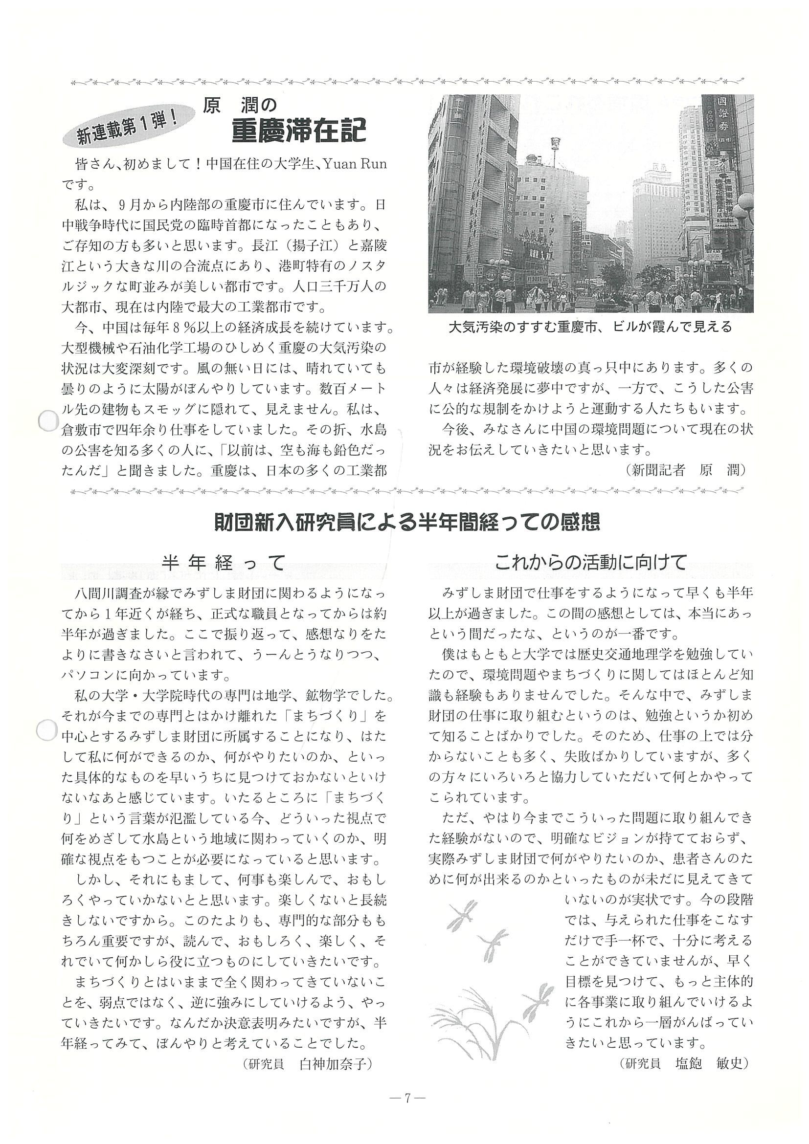 みずしま財団たよりは、今号から紙面を8面立てとし、内容のより一層の充実を図りました。また、大気汚染の進む中国からのレポートや連載コラムもスタートします。
