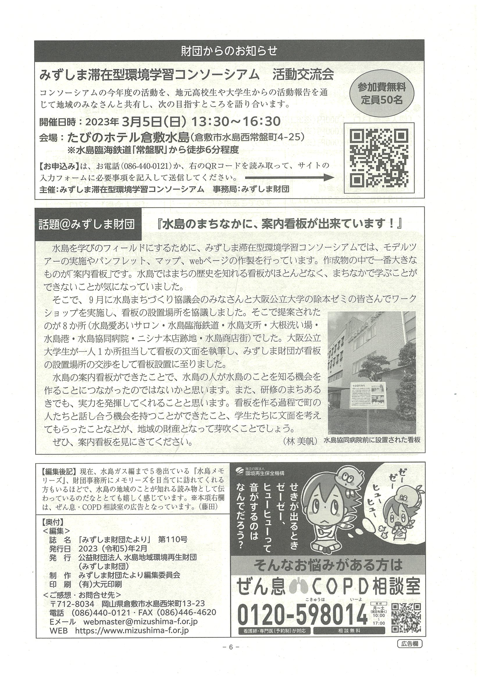 ■財団からのお知らせ「みずしま滞在型環境学習コンソーシアム 活動交流会」、話題@みずしま財団『水島のまちなかに、案内看板が出来ています!』