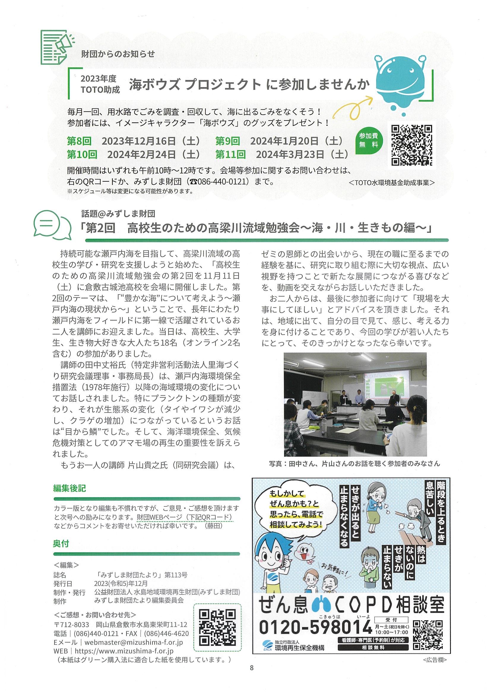 話題@みずしま財団 『第2回高校生のための高梁川流域勉強会~海・川・生きもの編~』