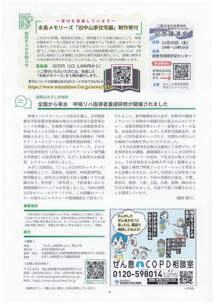 ■財団からのお知らせ 「水島メモリーズ 旧中山家住宅編 制作寄付 募集中」「石油流出事故から50年 記念講演会」